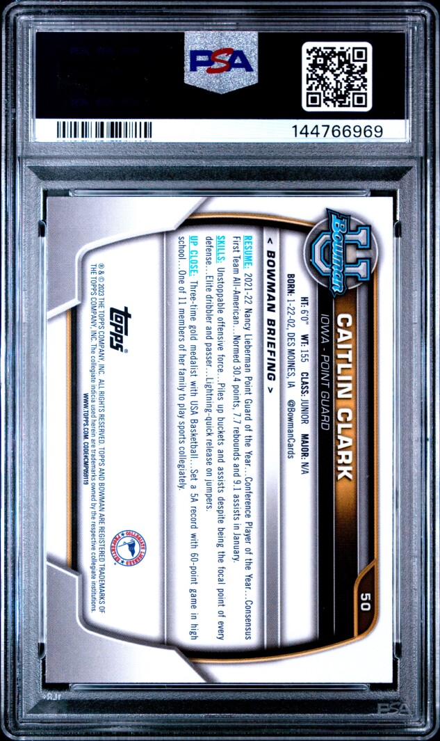 Certified by Professional Sports Authenticator (PSA) and featuring the official certification number 144766969, this card offers authenticity and peace of mind. Whether you’re investing in the future of women’s basketball or expanding your Bowman collection, this card is a fantastic find—secure it today before it’s gone!