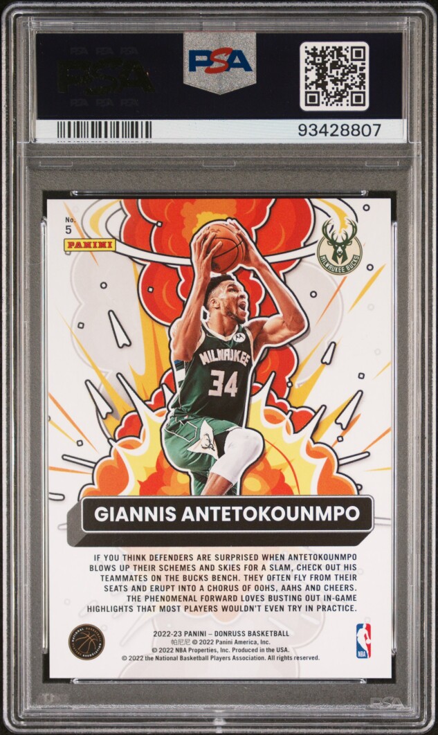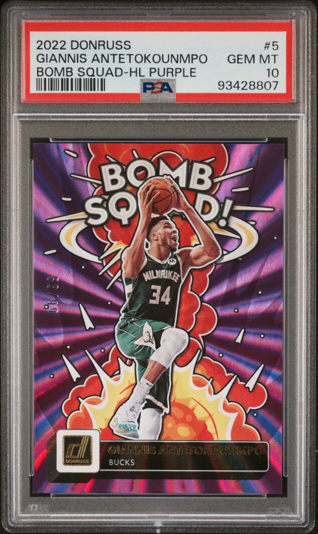 The 2022 Donruss Bomb Squad HL Purple Giannis Antetokounmpo card is a highly sought-after sports trading card featuring the star basketball player from the Milwaukee Bucks. This limited edition card, numbered out of 99, has been professionally graded as a PSA 10 GEM MINT, making it a perfect addition to any collector's card set. With its stunning purple parallel variety and premium card stock material, this insert card from the Bomb Squad set is a valuable piece for fans of Giannis Antetokounmpo and the NBA.