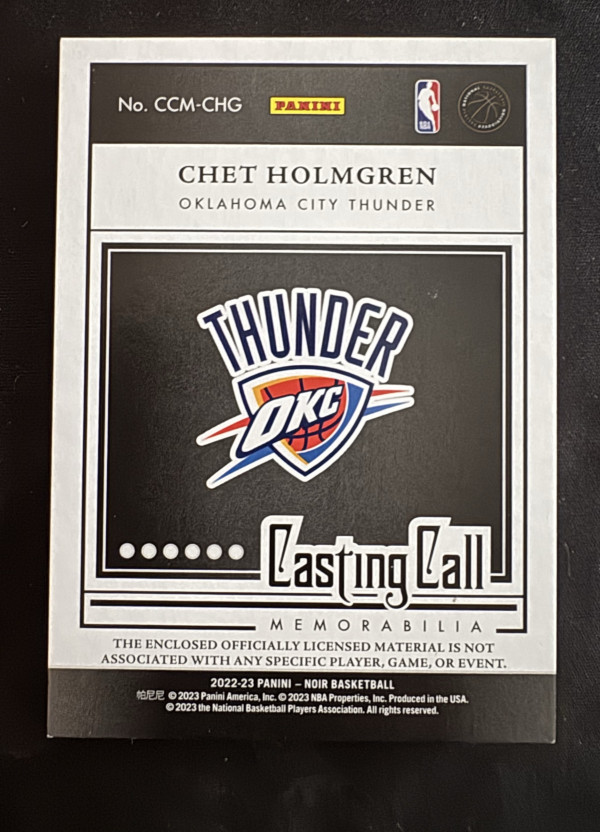 2022 Panini Noir Casting Call Memorabilia /99 Chet Holmgren #CCM-CHG Rookie RC