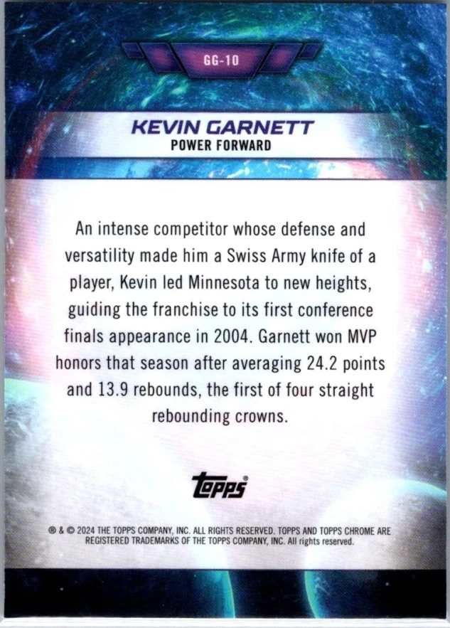 This is a nice example of a 2023-24 Topps Chrome Cosmic #GG-10 Kevin Garnett Galaxy Greats