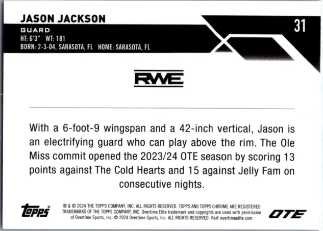This is a nice example of a 2023-24 Topps Chrome Overtime Elite #31 Jason Jackson Red/Yellow OTE Refractors