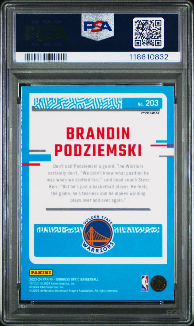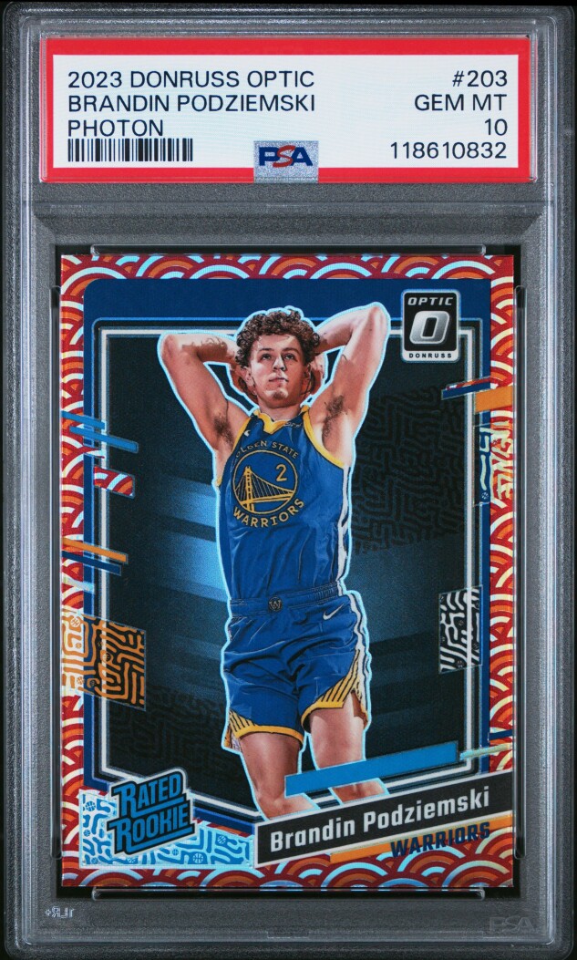 The product is a 2023 Donruss Optic Photon Brandin Podziemski rookie trading card, graded PSA 10 GEM MINT. This card belongs to the National Basketball Association (NBA) league and is a part of the 2023-24 Panini Donruss Optic set. The card features a Photon Prizm parallel/variety and is a base set addition for the Golden State Warriors team. As a Rated Rookie card, it holds value for collectors and fans alike who are looking to add a high-quality piece to their sports trading card collection.