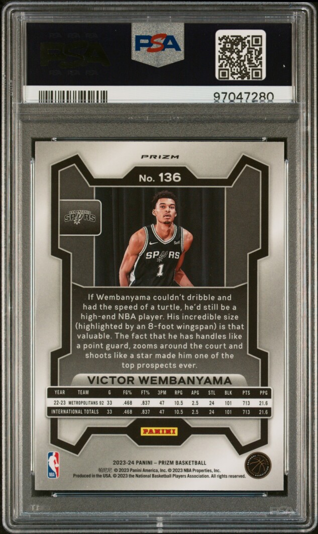 You are purchasing a 2023 Panini Prizm Victor Wembanyama #136 Silver Rookie Short Print PSA 10. You will receive the exact item in the photographs.
