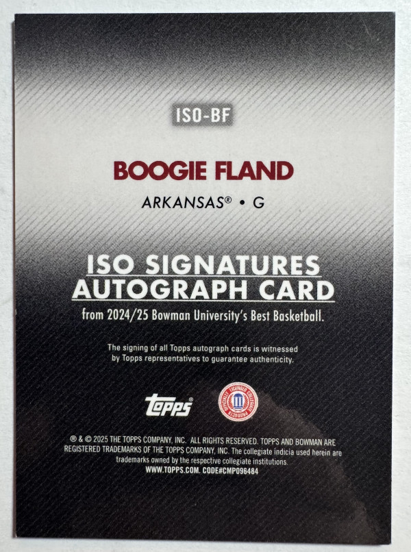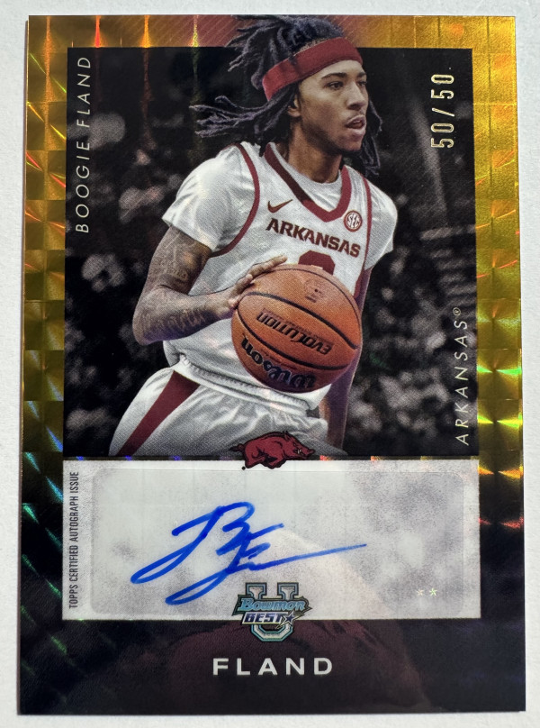 The product is a 2024-25 Bowman University Best ISO Signatures Gold Refractor trading card featuring Boogie Fland of the Arkansas Razorbacks. This single-insert card is autographed by Boogie Fland and serial numbered 50/50, making it a limited edition collectible. Manufactured by Topps, this basketball trading card is part of the 2024-25 Bowman University Best set and is a highly sought-after item for fans and collectors alike.
