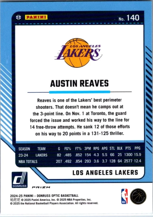 This is a nice example of a 2024-25 Donruss Optic #140 Austin Reaves Purple