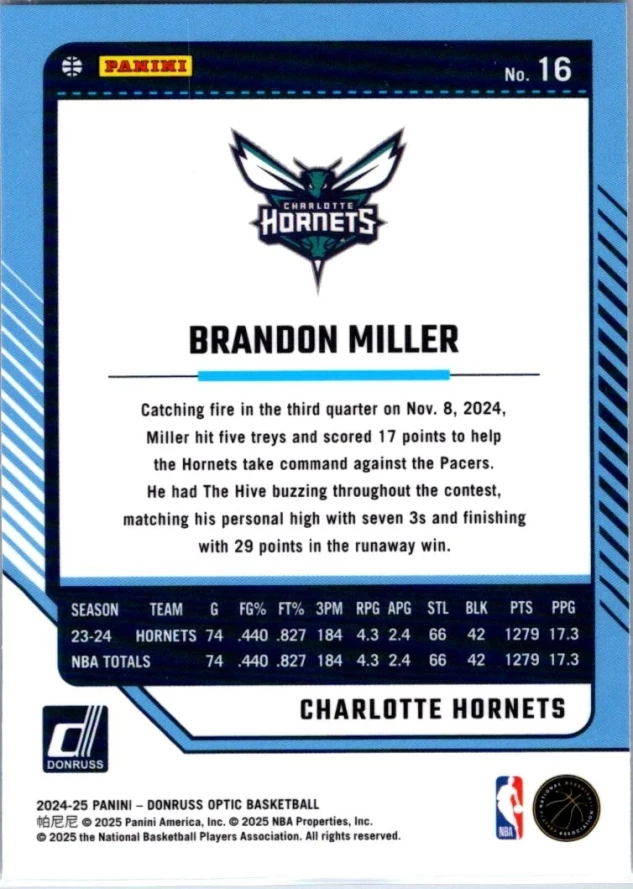 This is a nice example of a 2024-25 Donruss Optic #16 Brandon Miller