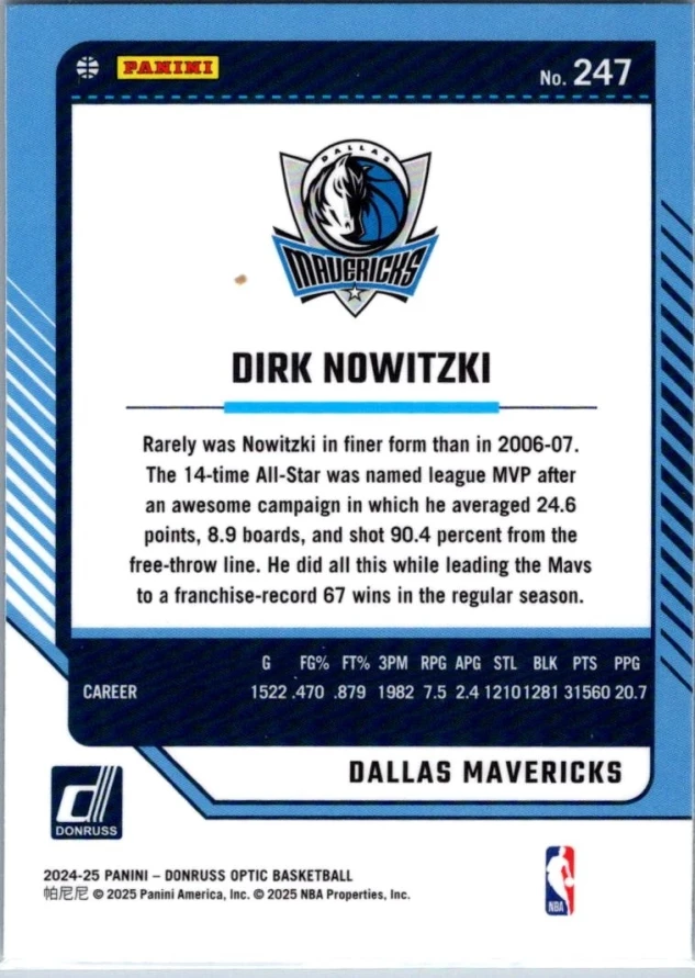 This is a nice example of a 2024-25 Donruss Optic #247 Dirk Nowitzki