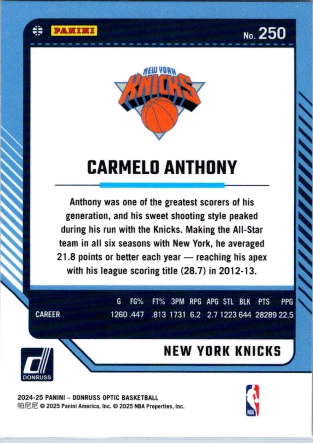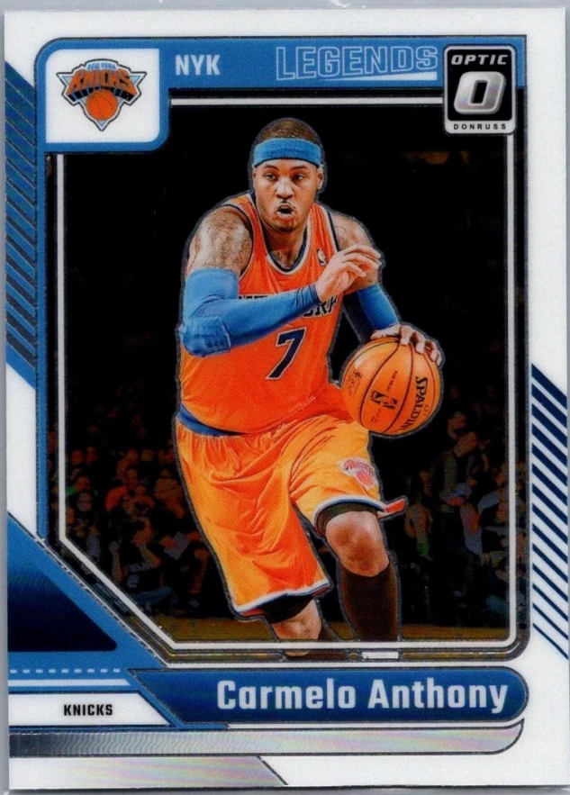 This is a nice example of a 2024-25 Donruss Optic #250 Carmelo Anthony