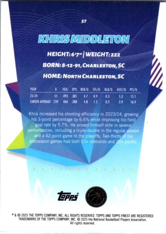 This is a nice example of a 2024-25 Finest #57 Khris Middleton Purple Refractor