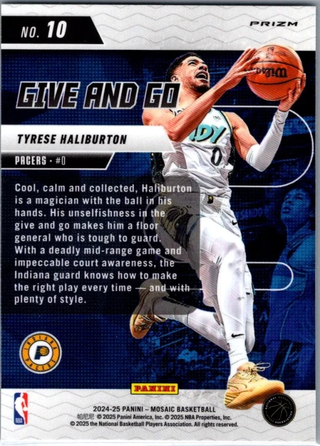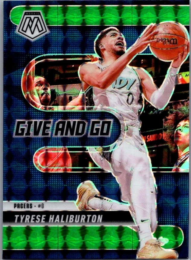 This is a nice example of a 2024-25 Panini Mosaic #10 Tyrese Haliburton Give and Go Mosaic Green