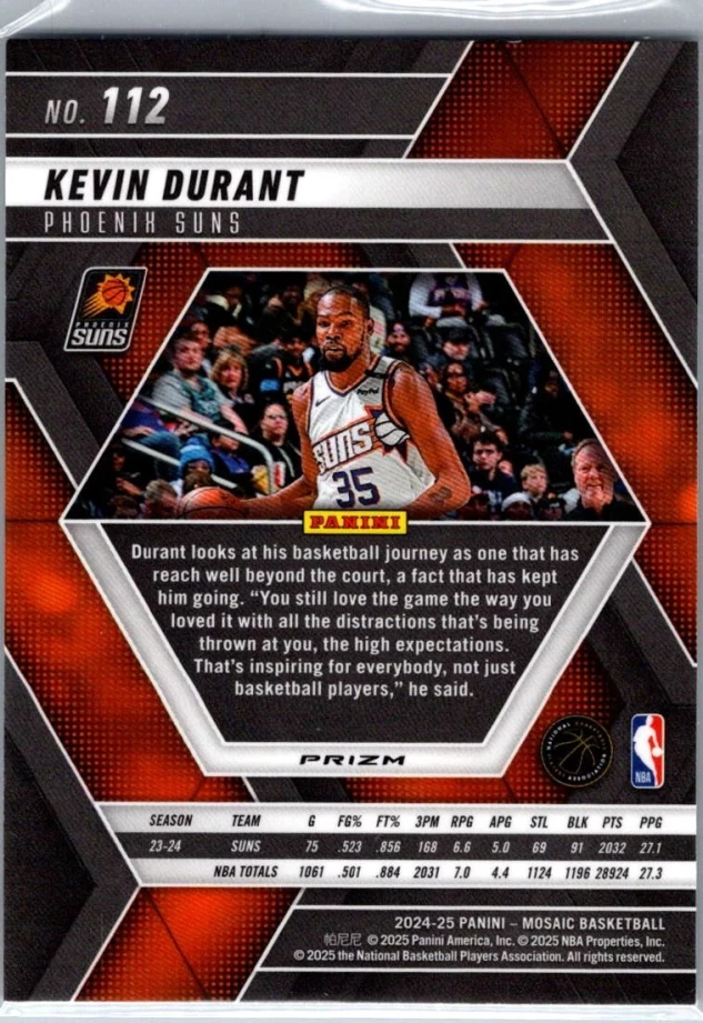 This is a nice example of a 2024-25 Panini Mosaic #112 Kevin Durant Mosaic