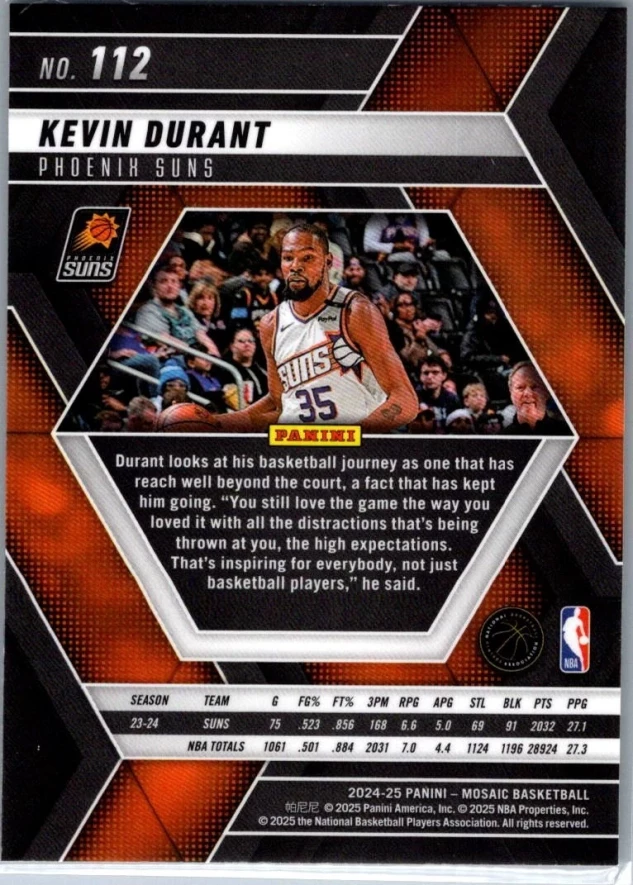 This is a nice example of a 2024-25 Panini Mosaic #112 Kevin Durant