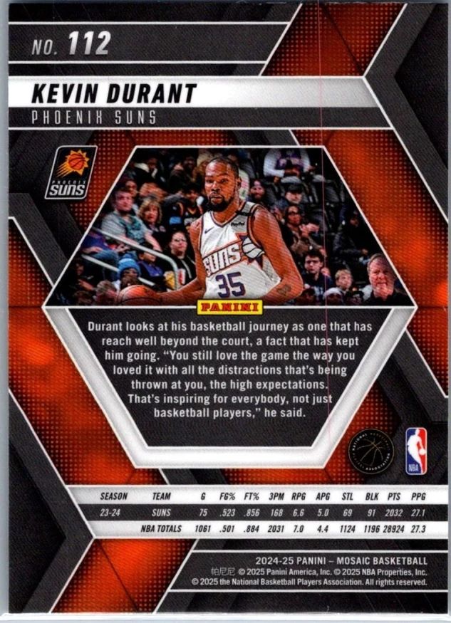 This is a nice example of a 2024-25 Panini Mosaic #112 Kevin Durant