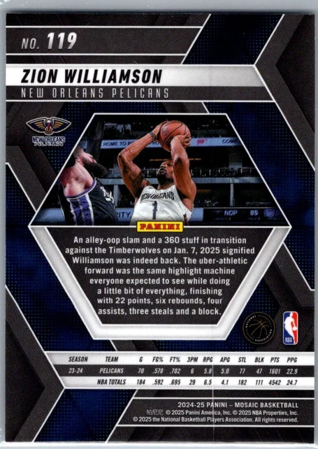 This is a nice example of a 2024-25 Panini Mosaic #119 Zion Williamson