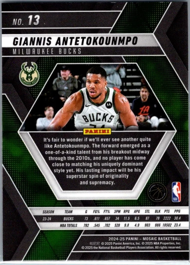 This is a nice example of a 2024-25 Panini Mosaic #13 Giannis Antetokounmpo