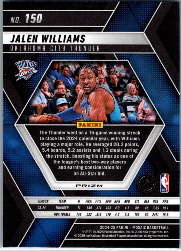 This is a nice example of a 2024-25 Panini Mosaic #150 Jalen Williams Green Mosaic