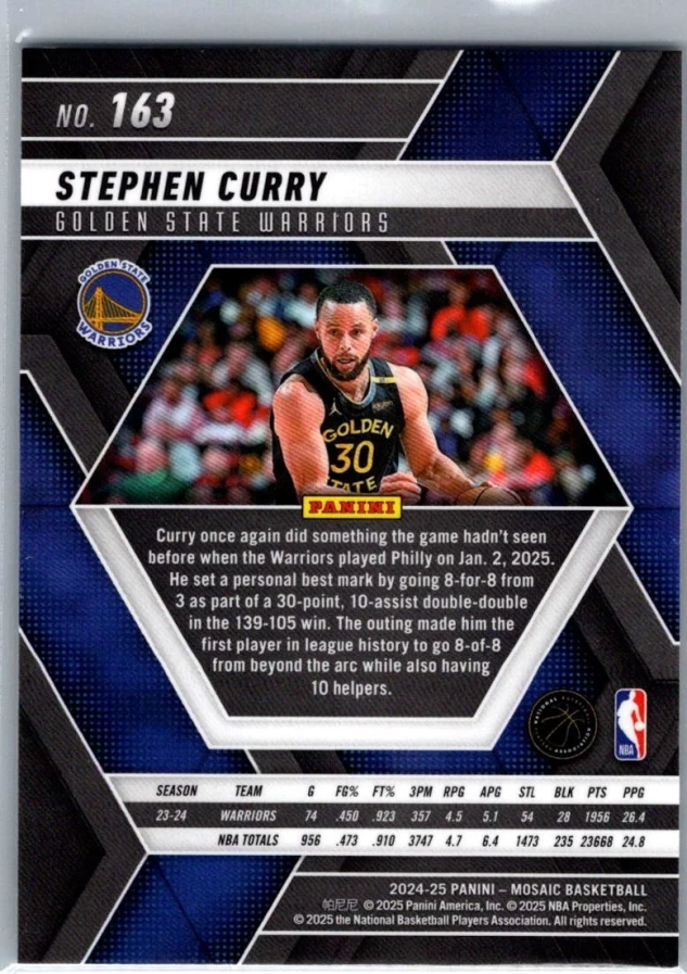 This is a nice example of a 2024-25 Panini Mosaic #163 Stephen Curry