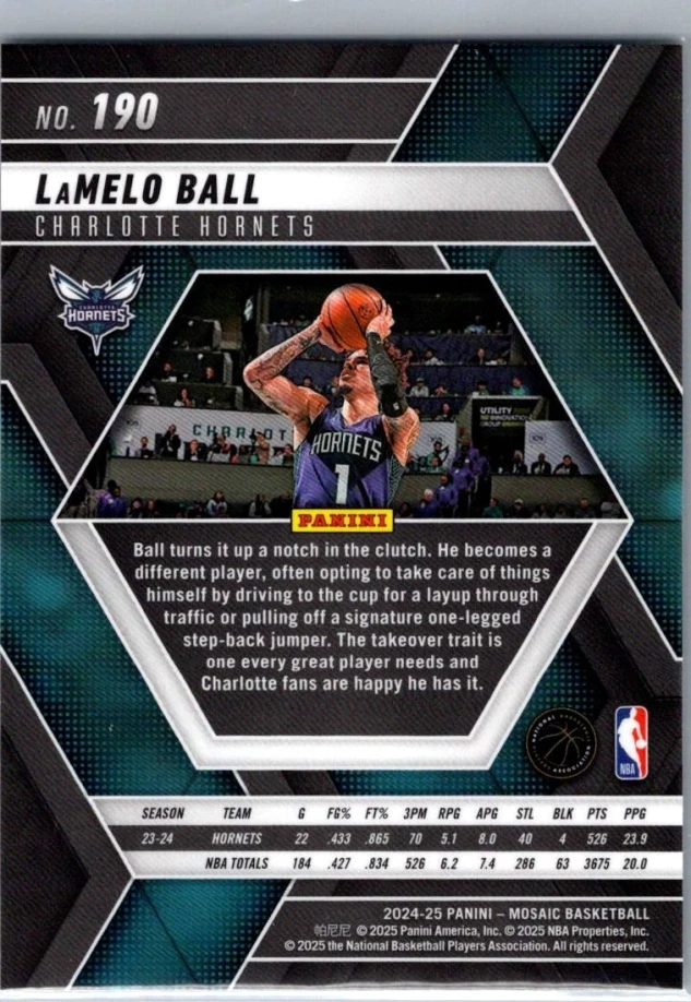 This is a nice example of a 2024-25 Panini Mosaic #190 LaMelo Ball
