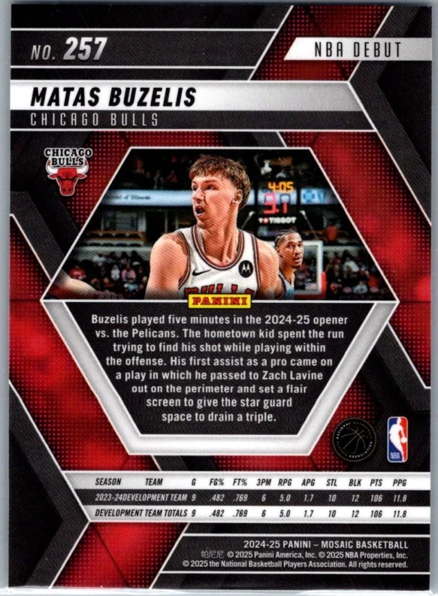This is a nice example of a 2024-25 Panini Mosaic #257 Matas Buzelis Base Mosaic