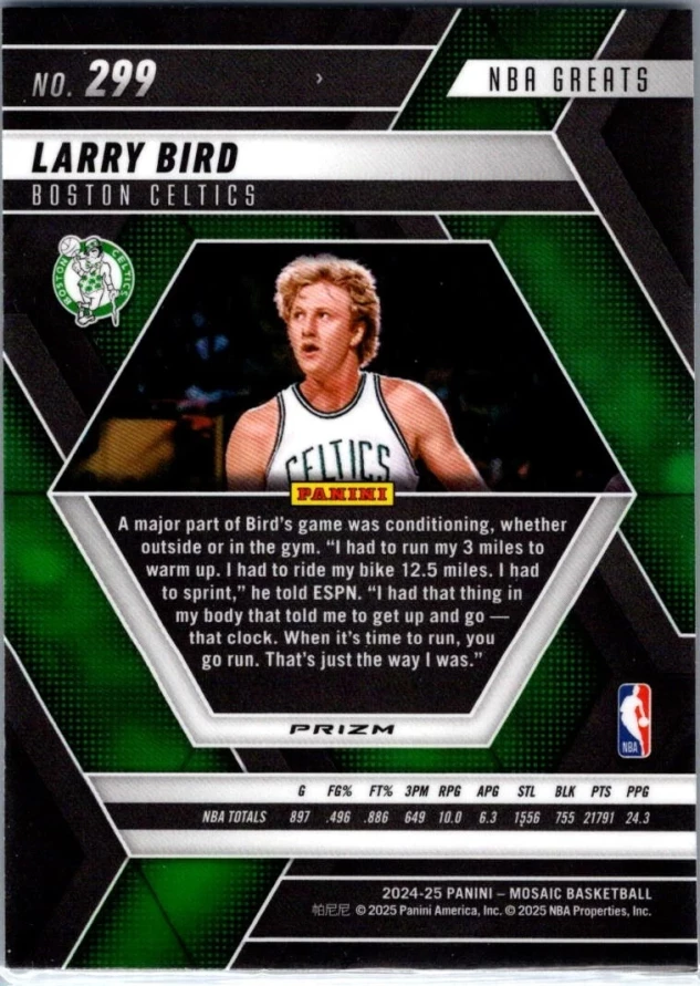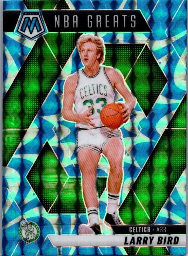 This is a nice example of a 2024-25 Panini Mosaic #299 Larry Bird Reactive Blue Mosaic