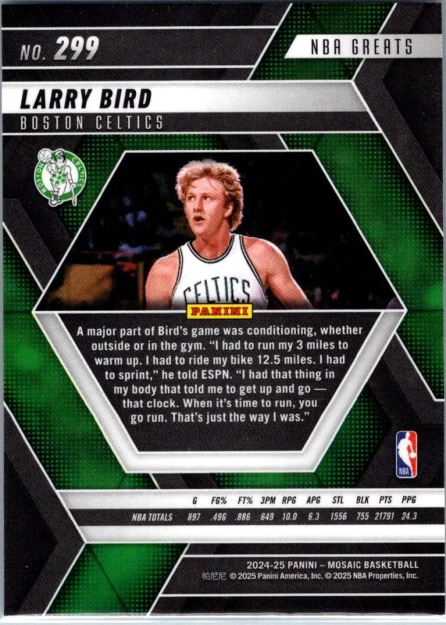 This is a nice example of a 2024-25 Panini Mosaic #299 Larry Bird