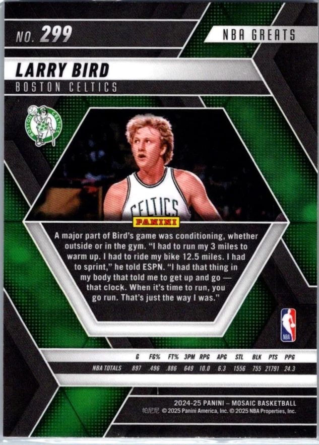 This is a nice example of a 2024-25 Panini Mosaic #299 Larry Bird