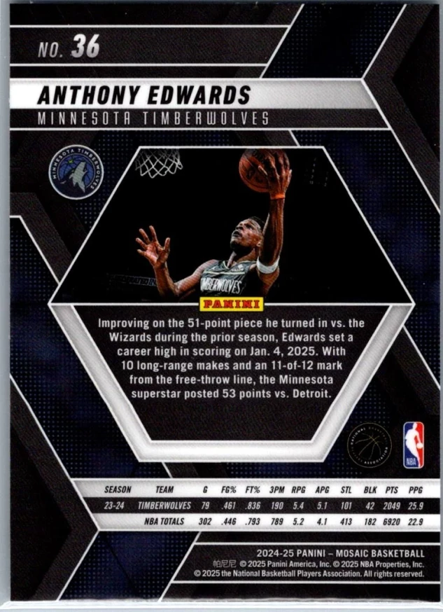 This is a nice example of a 2024-25 Panini Mosaic #36 Anthony Edwards