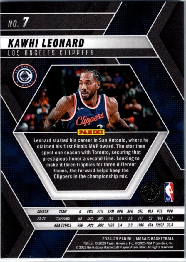 This is a nice example of a 2024-25 Panini Mosaic #7 Kawhi Leonard
