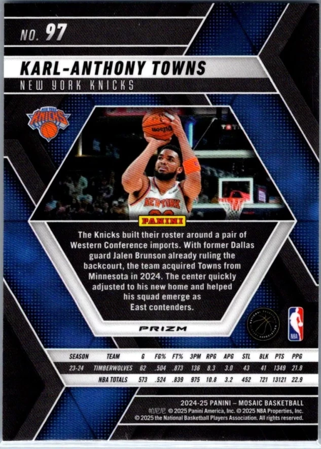 This is a nice example of a 2024-25 Panini Mosaic #97 Karl-Anthony Towns Reactive Blue Mosaic
