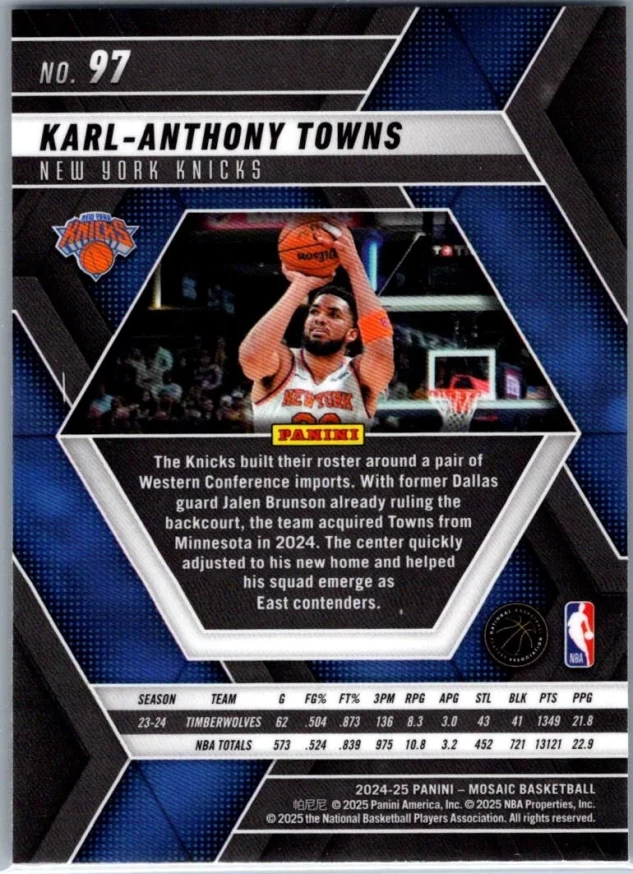 This is a nice example of a 2024-25 Panini Mosaic #97 Karl-Anthony Towns