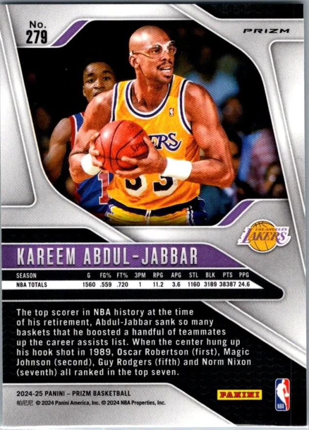 This is a nice example of a 2024-25 Panini Prizm #279 Kareem Abdul-Jabbar Prizms Green