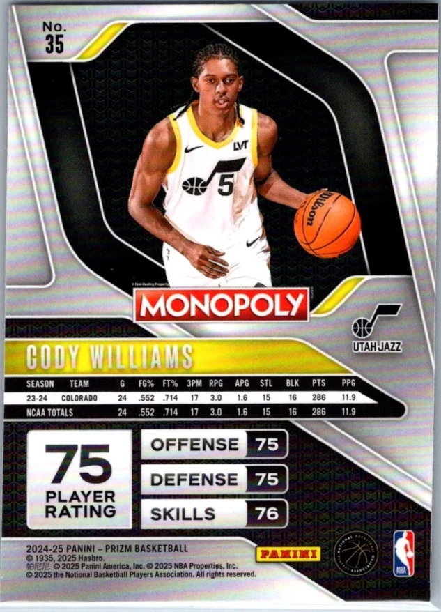 This is a nice example of a 2024-25 Panini Prizm Monopoly #35 Cody Williams