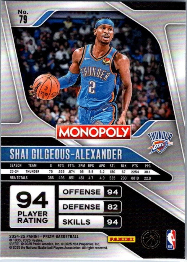 This is a nice example of a 2024-25 Panini Prizm Monopoly #79 Shai Gilgeous-Alexander