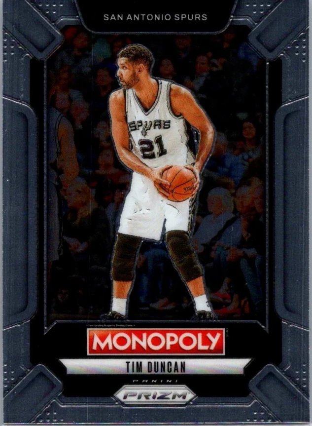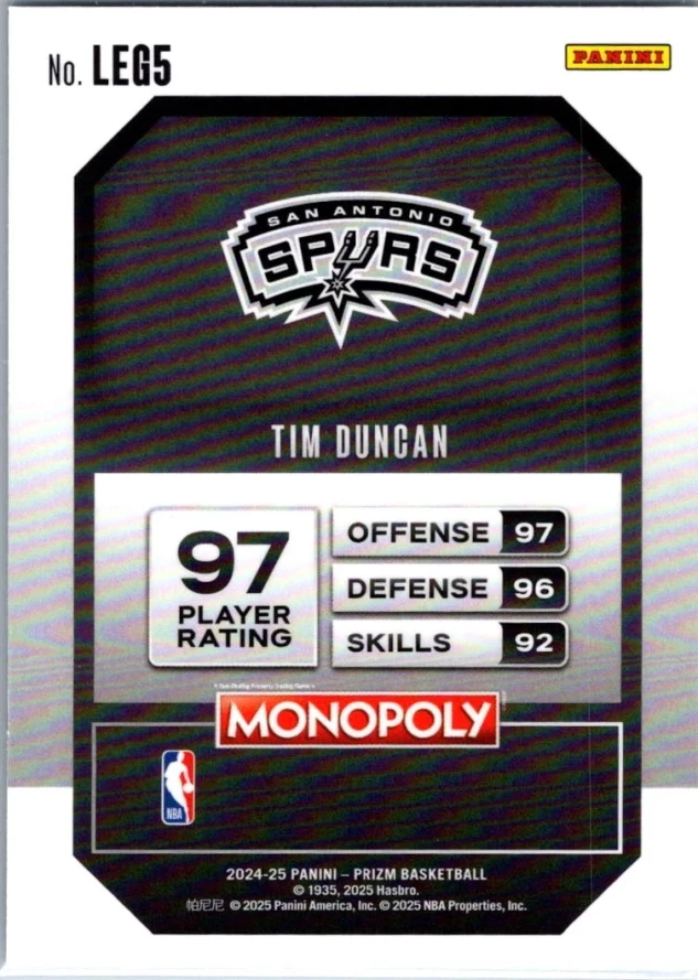 This is a nice example of a 2024-25 Panini Prizm Monopoly #LEG5 Tim Duncan Legends