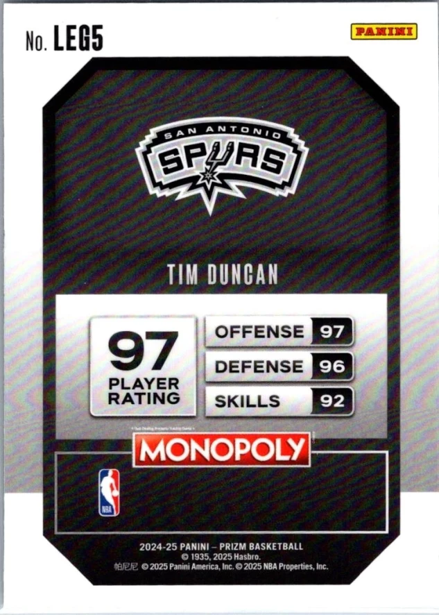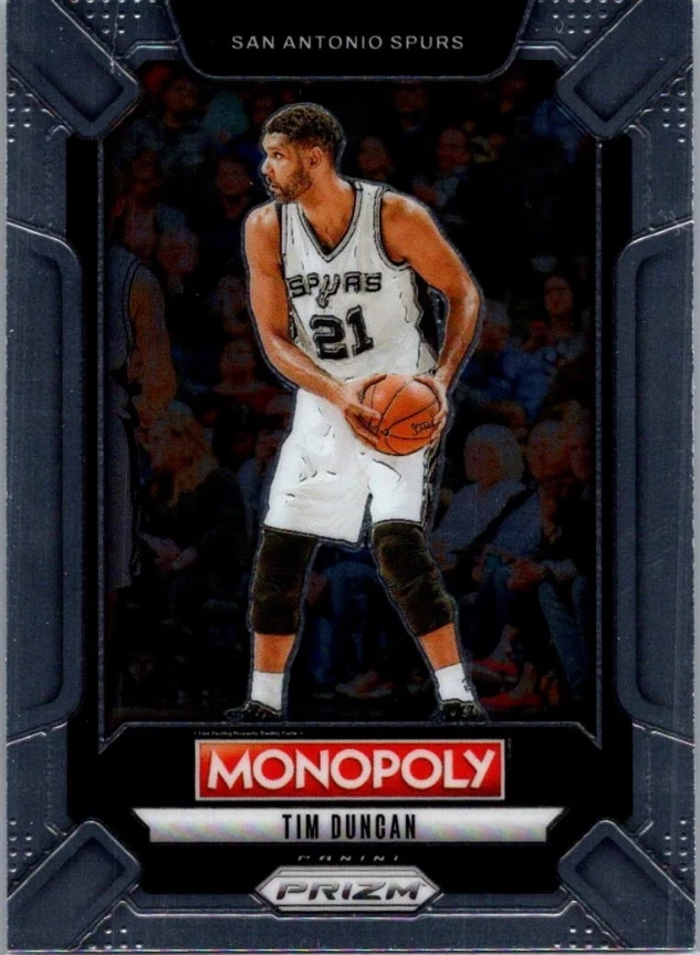 This is a nice example of a 2024-25 Panini Prizm Monopoly #LEG5 Tim Duncan Legends