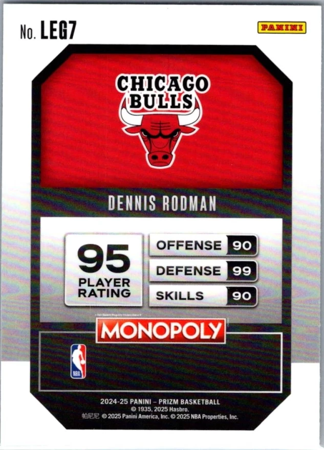 This is a nice example of a 2024-25 Panini Prizm Monopoly #LEG7 Dennis Rodman Legends