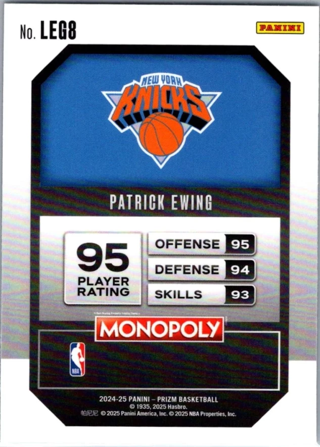 This is a nice example of a 2024-25 Panini Prizm Monopoly #LEG8 Patrick Ewing Legends