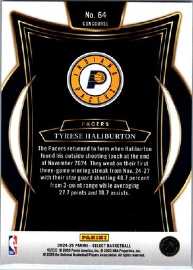 This is a nice example of a 2024-25 Panini Select #64 Tyrese Haliburton Blue (Retail)