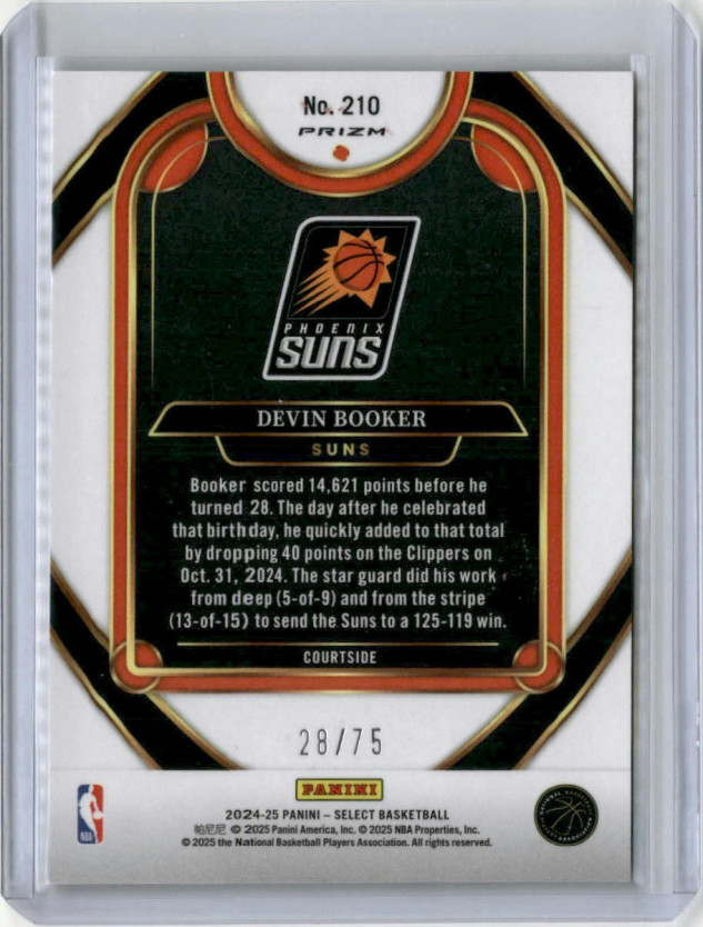 You are purchasing a 2024-25 Panini Select Devin Booker #210 White Disco Prizm /75. You will receive the exact item in the photographs. Thank you for looking.
