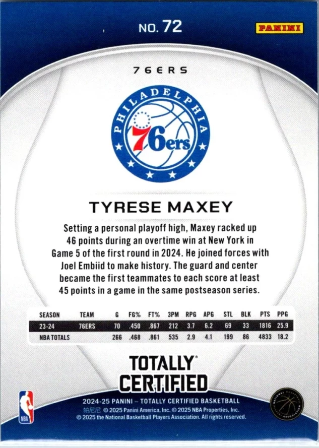 This is a nice example of a 2024-25 Panini Totally Certified #72 Tyrese Maxey