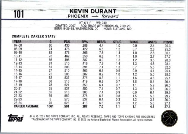 This is a nice example of a 2024-25 Topps Chrome Sapphire #101 Kevin Durant