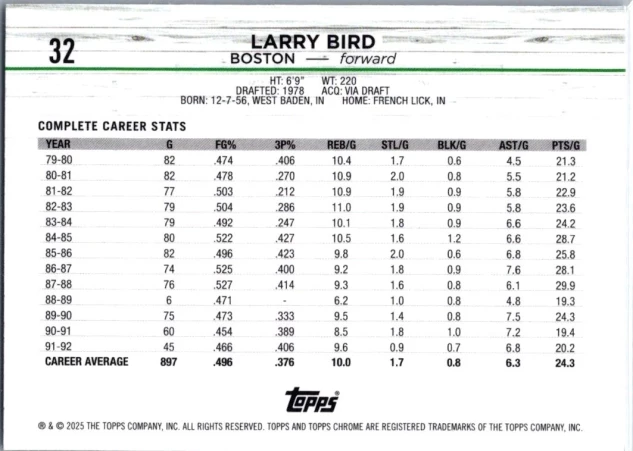 This is a nice example of a 2024-25 Topps Chrome Sapphire #32 Larry Bird