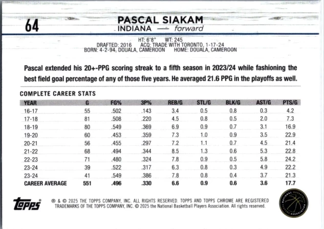 2024-25 Topps Chrome Sapphire #64 Pascal Siakam