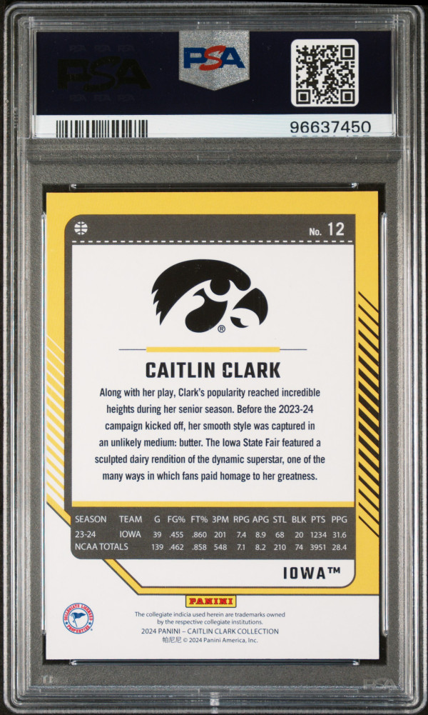 You are purchasing a 2024 Panini Caitlin Clark Collection Donruss Caitlin Clark #12 Parallel/Variety Rookie PSA 9. You will receive the exact item in the photographs. Thank you for looking.