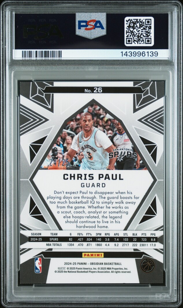 The product is a 2024 Panini Obsidian Electric Etch Jade Chris Paul trading card, numbered out of 25 and graded a PSA 10 GEM MINT. This original sports trading card features the player Chris Paul from the San Antonio Spurs in the National Basketball Association. Made of card stock with a thickness of 20 Pt., it is a sought-after collectible for basketball fans and card enthusiasts alike. The card is part of a limited set and comes with Panini Authentic autograph authentication, making it a valuable addition to any sports card collection.