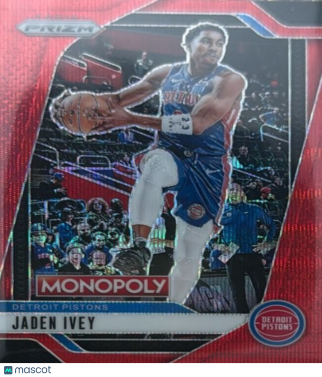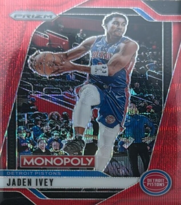 Score big with this 2024 Panini Prizm Monopoly Red Prizms Jaden Ivey card, exclusive to blaster boxes! This eye-catching parallel is a must-have for Detroit Pistons fans and collectors looking to add a standout rookie card to their NBA collection. The Red Prizms variety offers vibrant color and shine, making this card a true centerpiece.