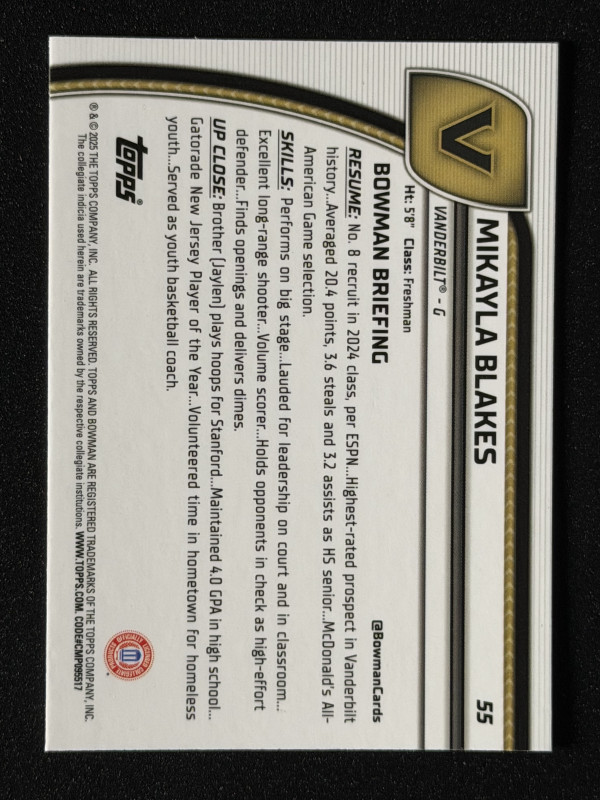 You are purchasing a 2024 Topps Bowman U Chrome Mikayla Blakes #55 .