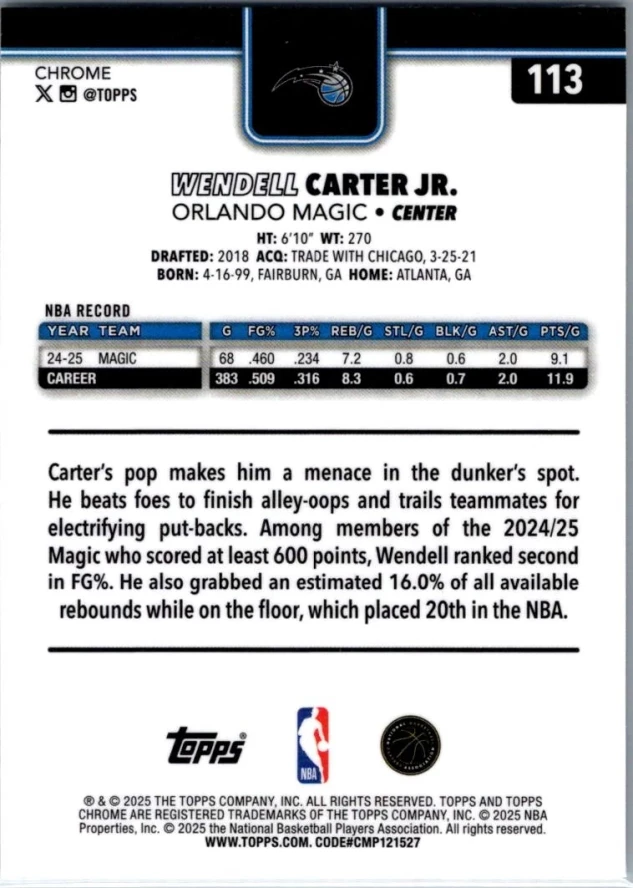 2025-26 Topps Chrome #113 Wendell Carter Jr.