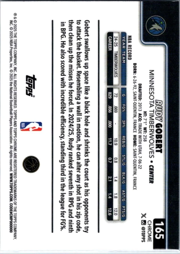 This is a nice example of a 2025-26 Topps Chrome #165 Rudy Gobert