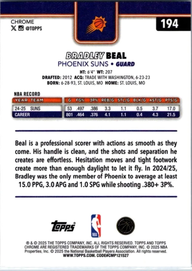 This is a nice example of a 2025-26 Topps Chrome #194 Bradley Beal